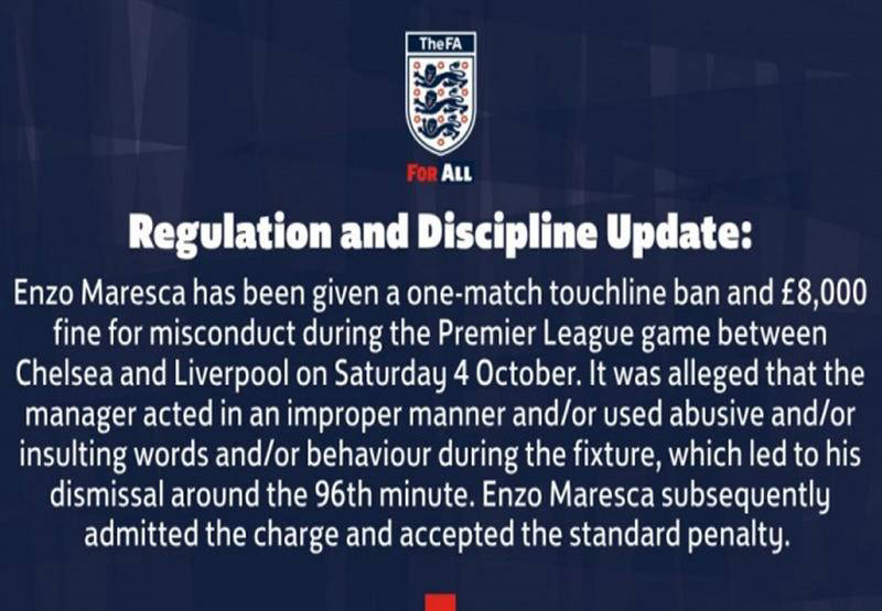 据英足总公告显示,在与利物浦的比赛中,马雷斯卡在第96分钟存在不当行为和使用侮辱性言语,导致主裁判出示红牌把他罚下场。鉴于此,马雷斯卡将接受一场禁赛,并需支付8000英镑罚款。他已承认错误并表示愿意接受相应的处罚。